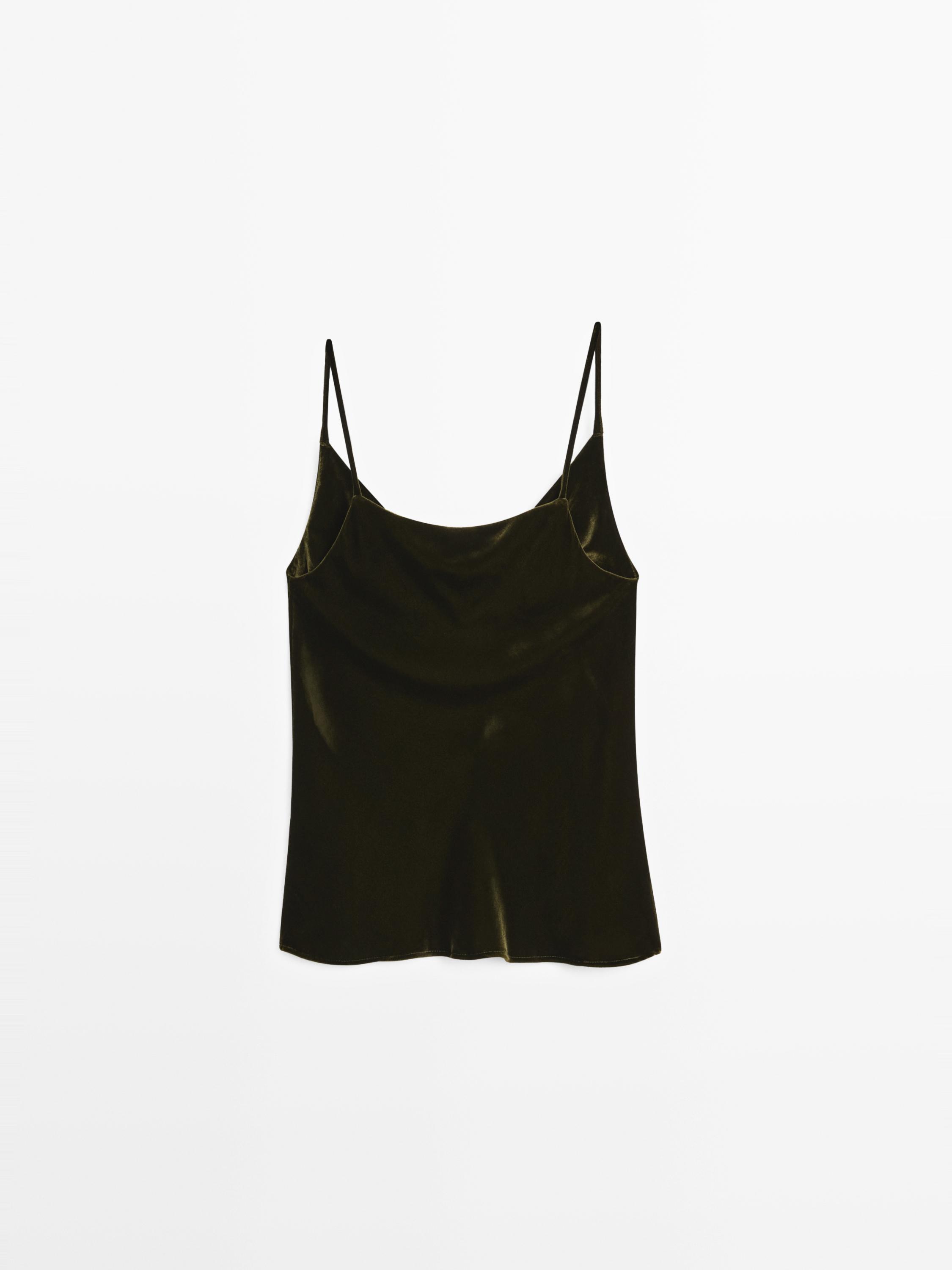 توب بفتحة صدر مستقيمة وحمالات رفيعة . فتحة عنق بثنيات. قماش مخمل. متاح قطعة بلون مماثل.