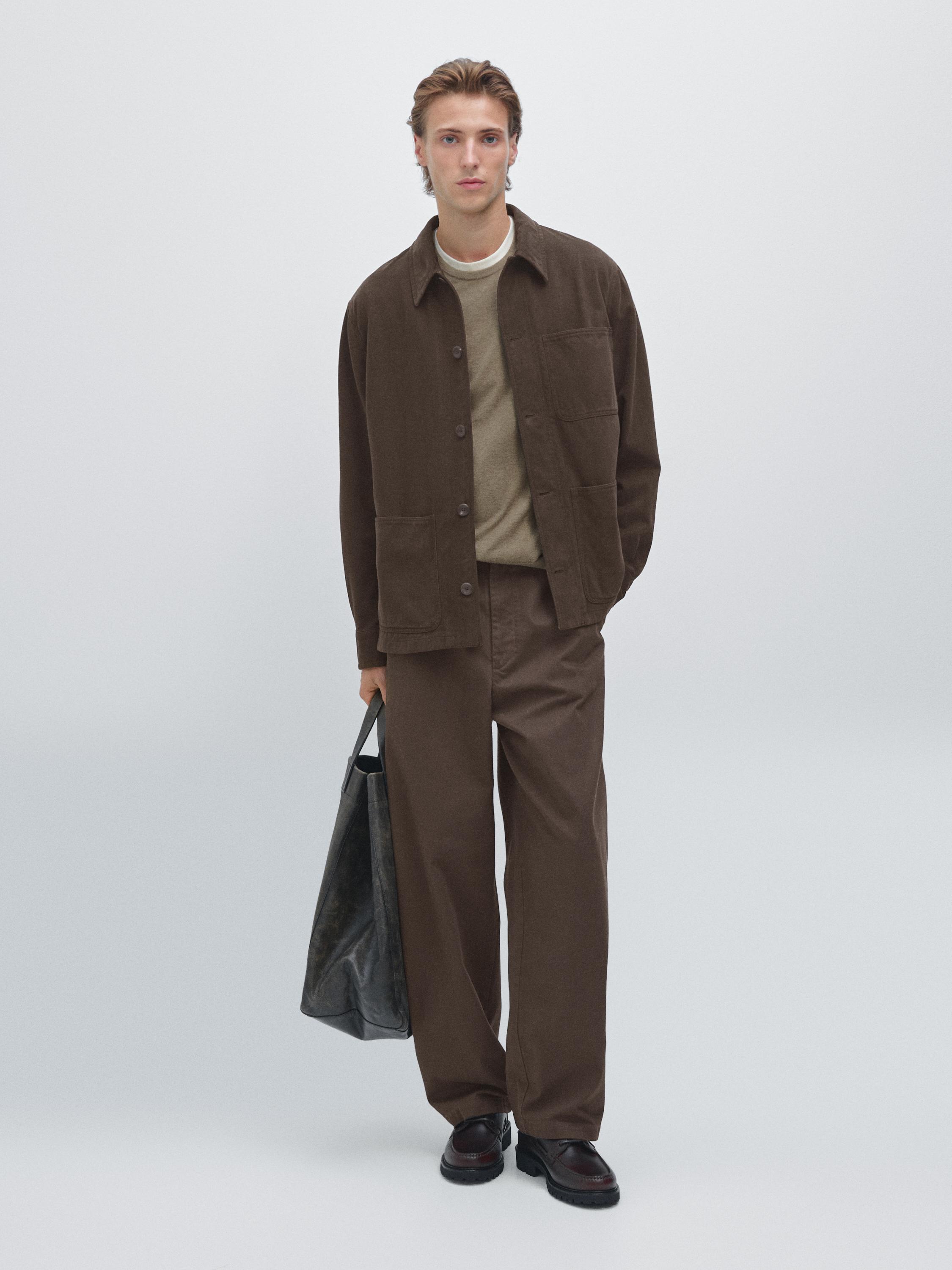 قميص سميك مصنوع 100% من القطن. أكمام طويلة بأساور بأزرار. طوق قميص. زر علوي أمامي. Three plastron pockets . لمسة نهائية ناعمة ومخملية.