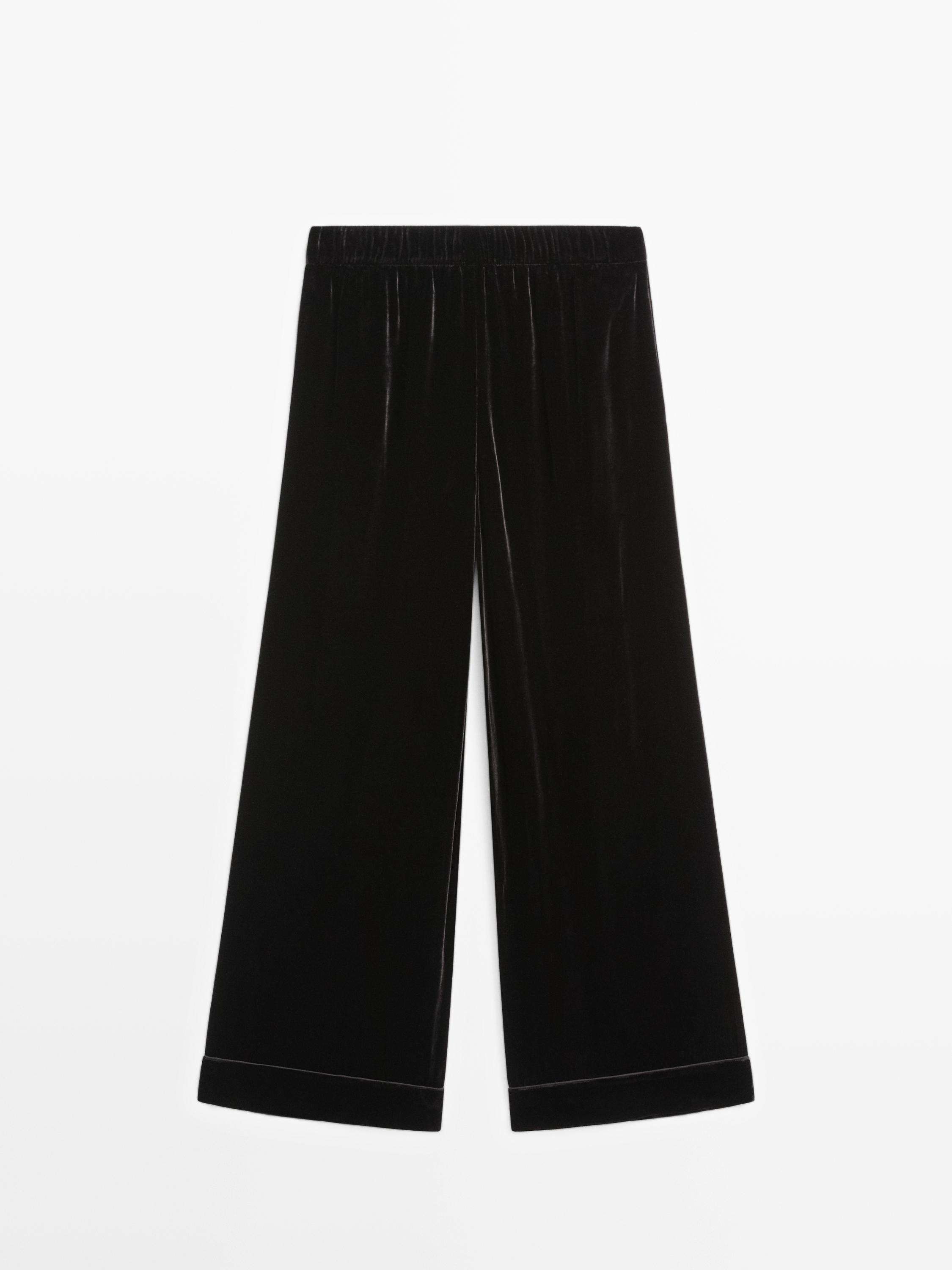 بنطلون بساق عريضة من نسيج بلمسة مخملية . تفصيل شريط خصر مرن. Detail of piping on the hem.
