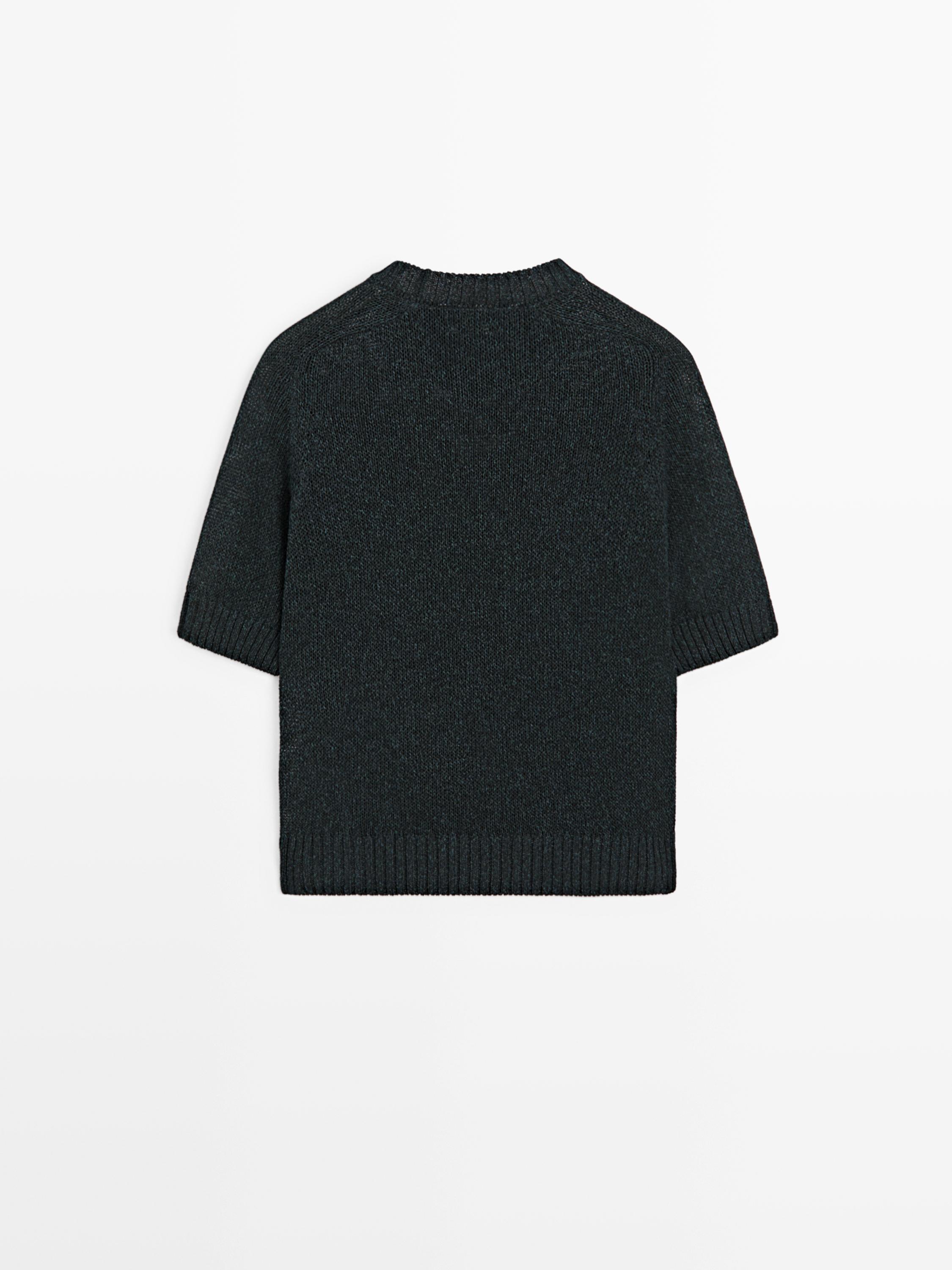 Wool blend knit sweater. Round neck. Short sleeves. Openwork fabric . Ribbed fabric .