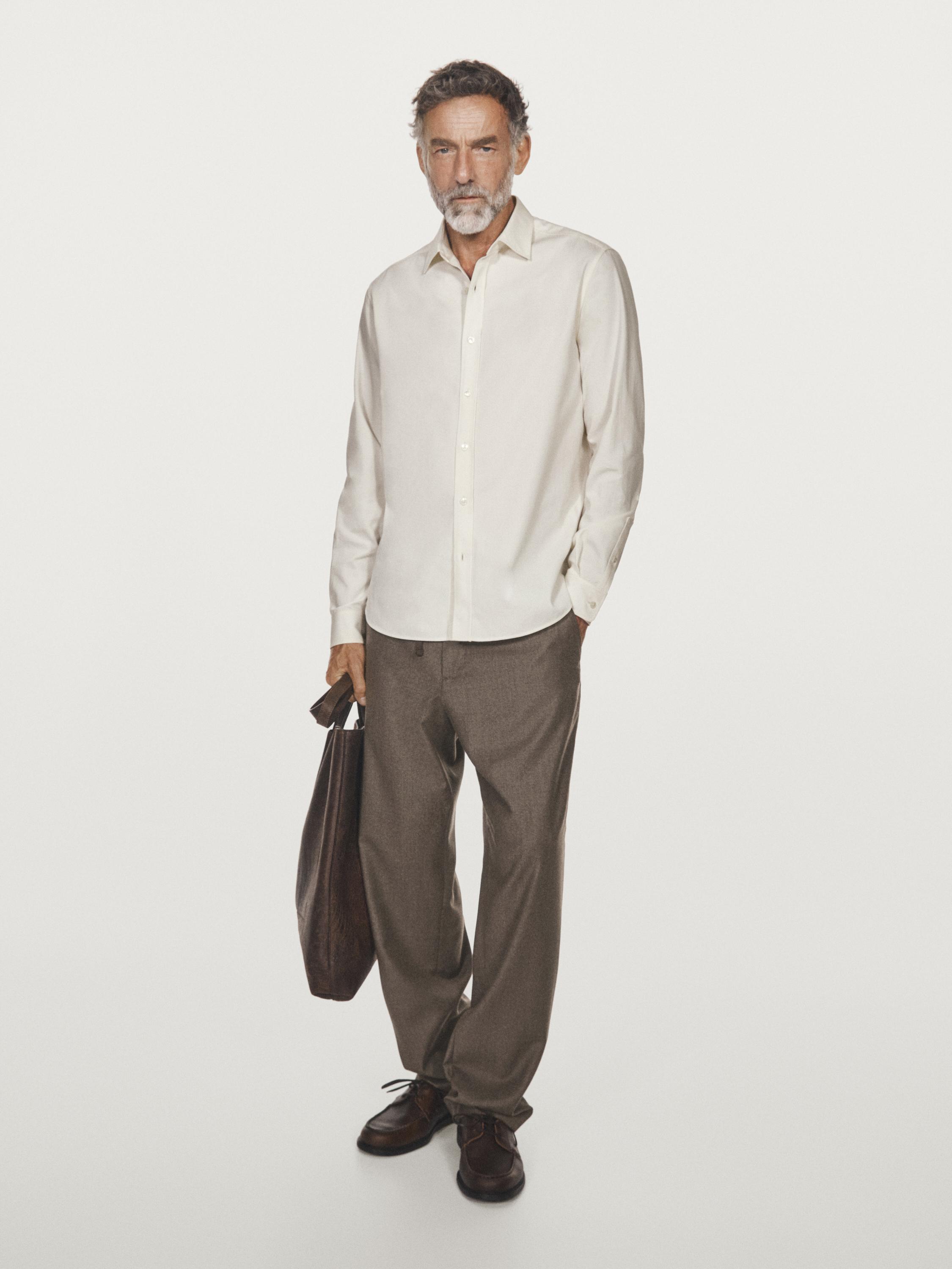 Štandardný strih: Tento štýl ponúka pohodlie s uvoľnenejším strihom na tele a ramenách, ktorý tvorí klasický, ale stále uvoľnený dojem. Dlhé rukávy s manžetami na gombíky. Košeľový golier. Predné zapínanie na gombíky. Vyrobené z tkaniny z bavlnenej zmesi.