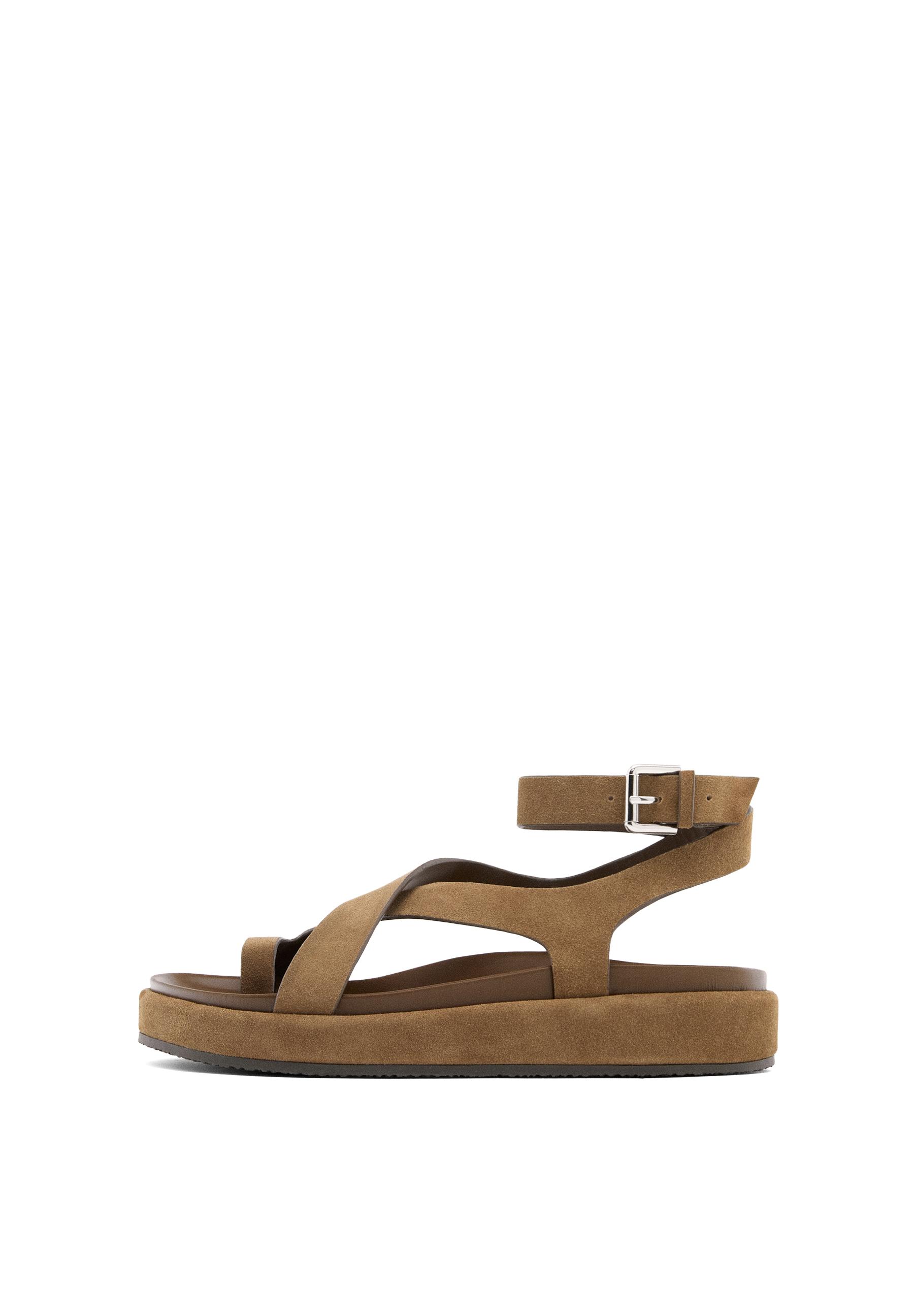Made of cowhide leather with a suede finish. ปิดด้วยหัวเข็มขัดด้านข้างปรับได้. ที่แยกนิ้วเท้า. พื้นรองเท้าซับในหนังแกะ.