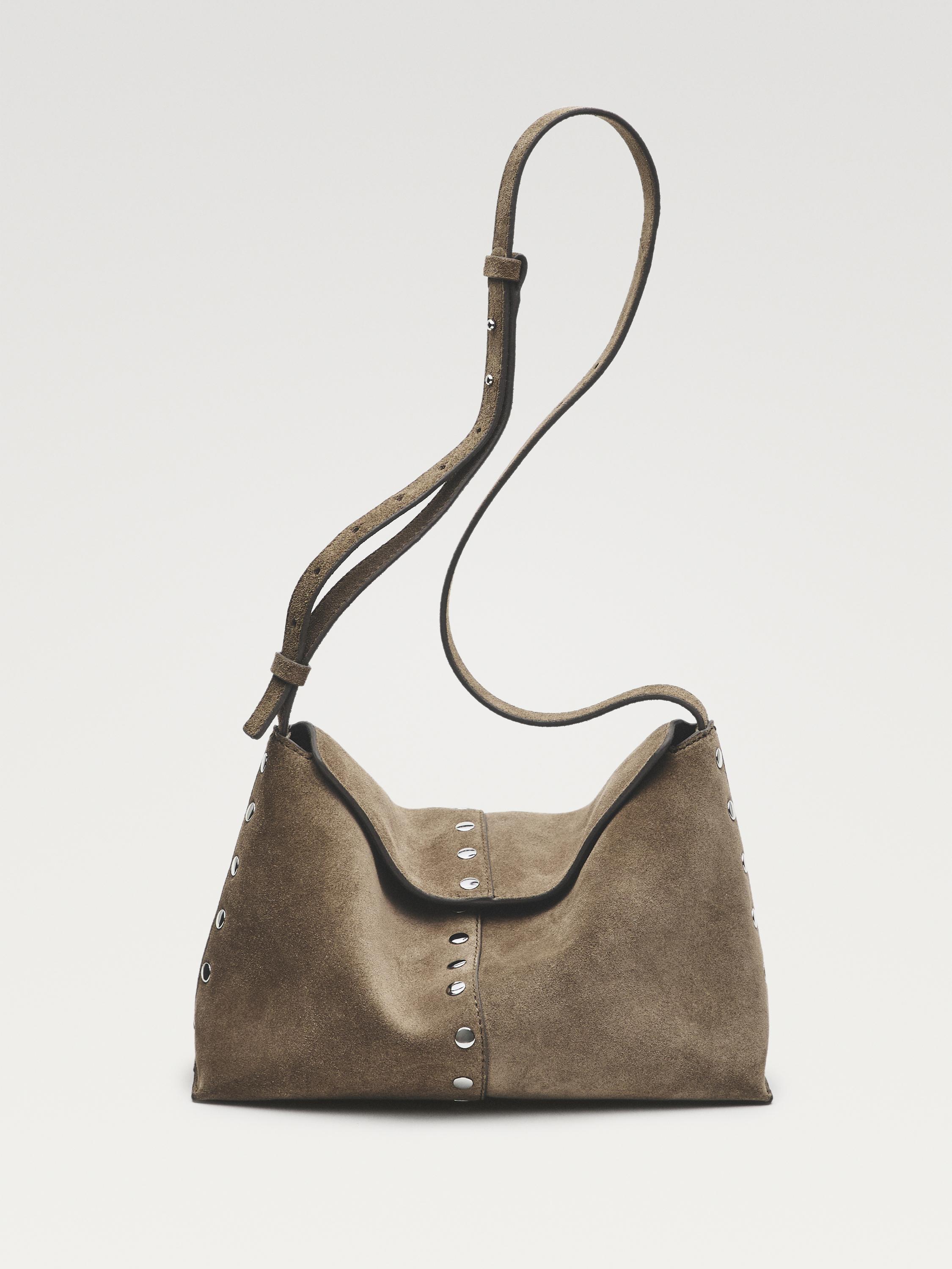 Handbag made of cowhide with a split leather finish. Adjustable and detachable strap. Metal stud detail.
