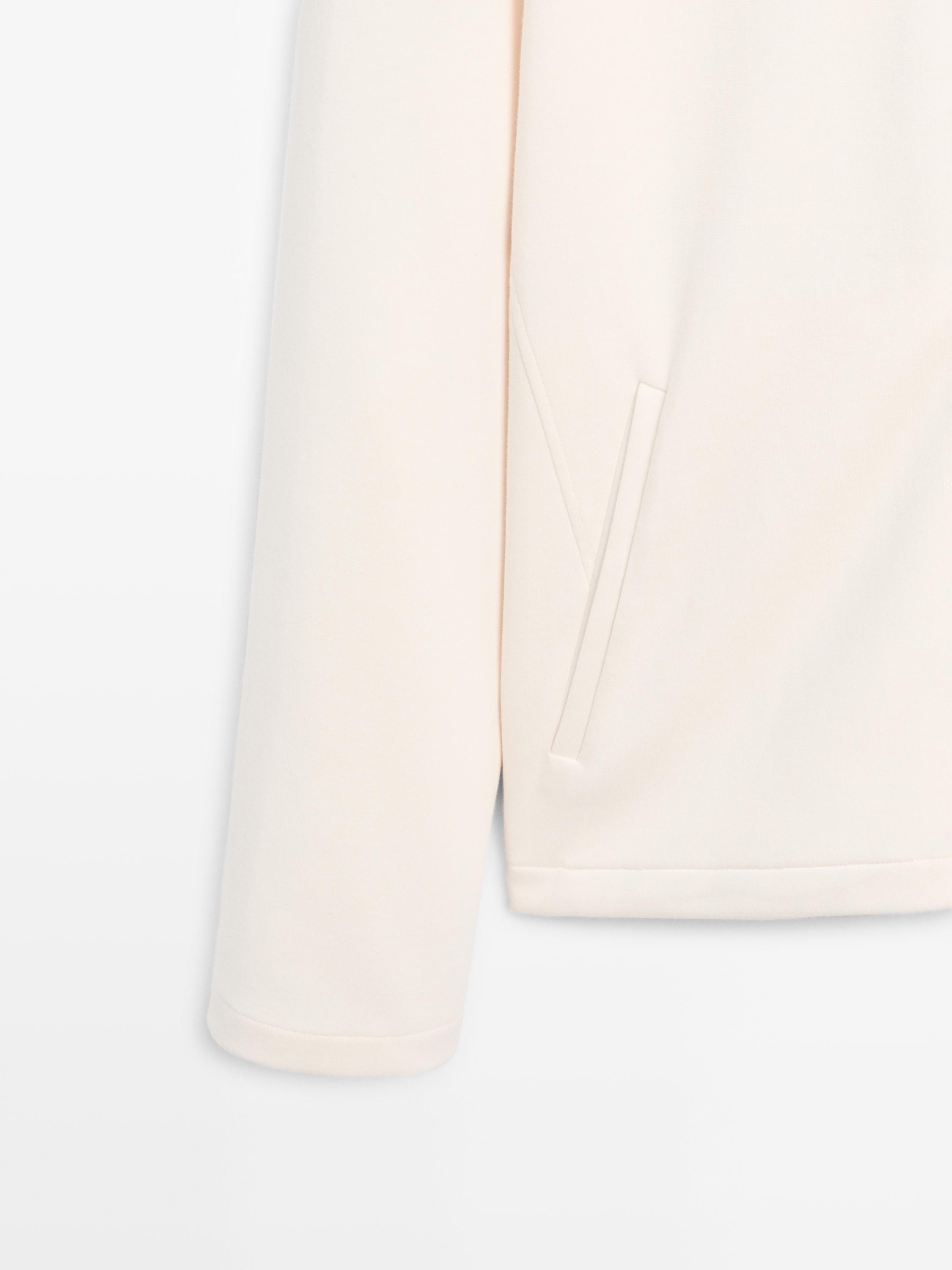 جاكيت مصنوع من قطن مخلوط. أكمام طويلة. إغلاق بسحّاب ثنائي الاتجاه. ياقة عالية مع غطاء رأس. جيوب على الجانبين.