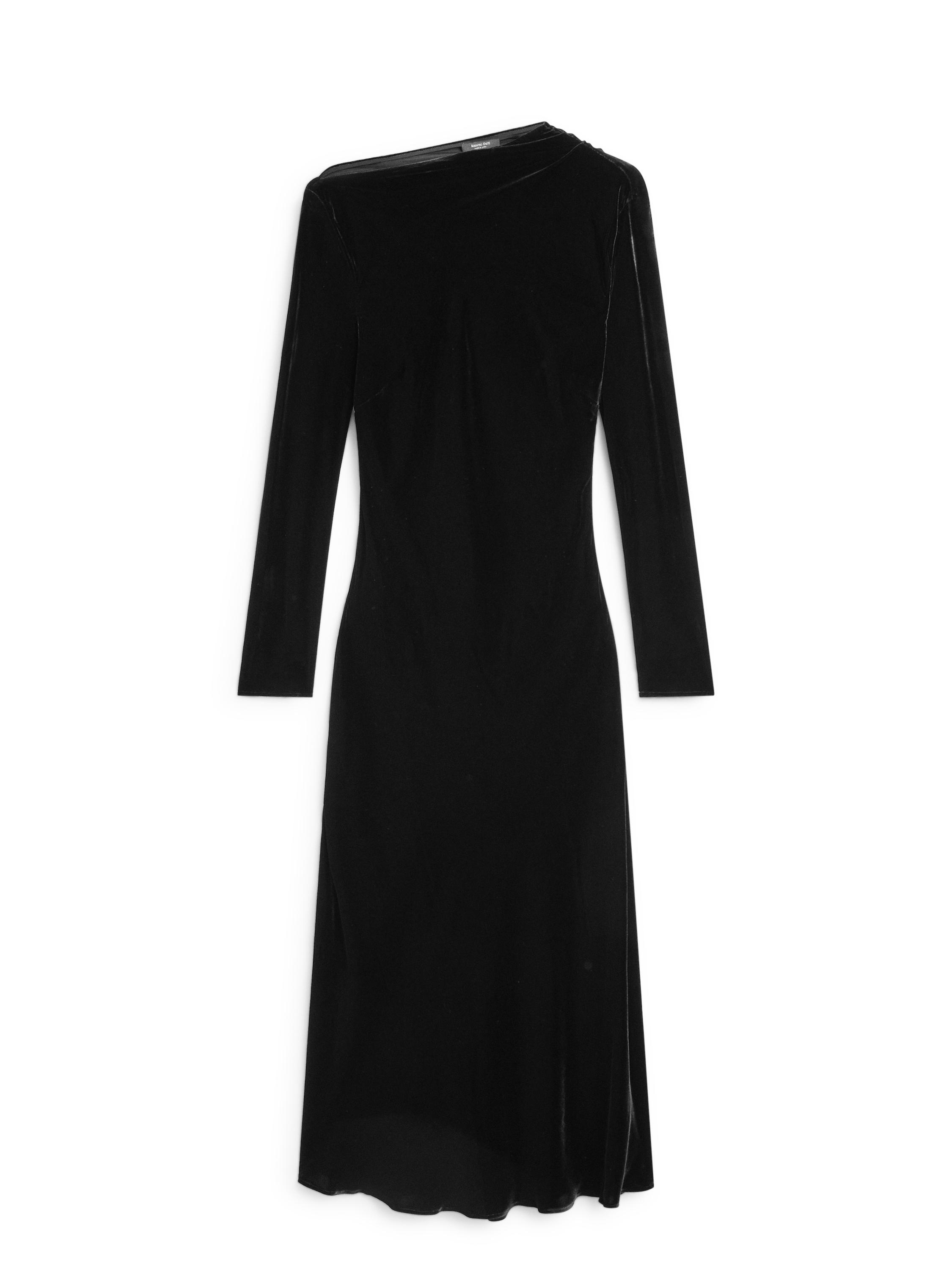 فستان طويل بياقة بوت. أكمام طويلة. قماش مخمل. قفل بسحاب جانبي.