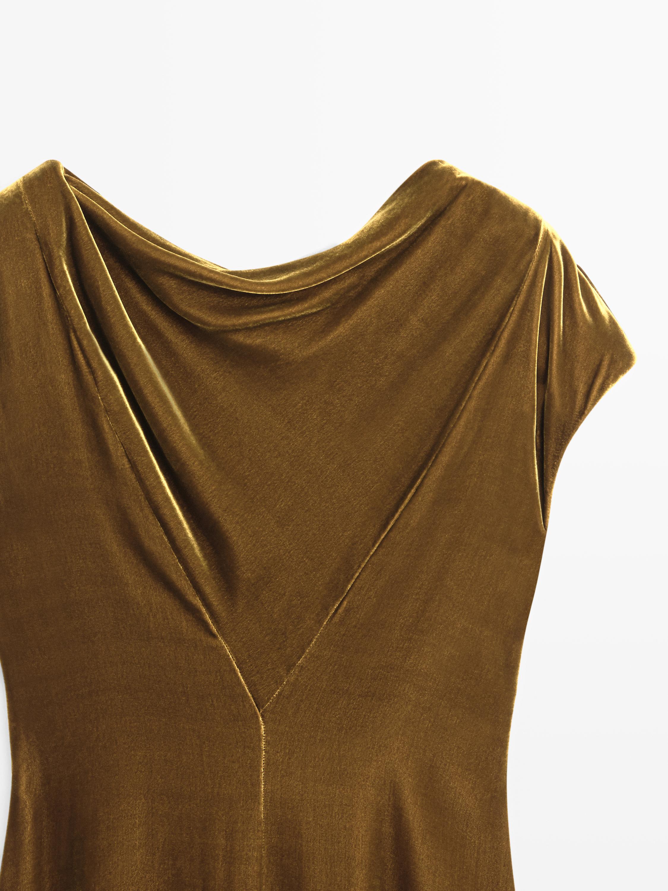 Robe longue à volants. Col drapé. Sans manches. Tissu velours. Fermeture éclair à l'arrière. Detail of shoulder pads.