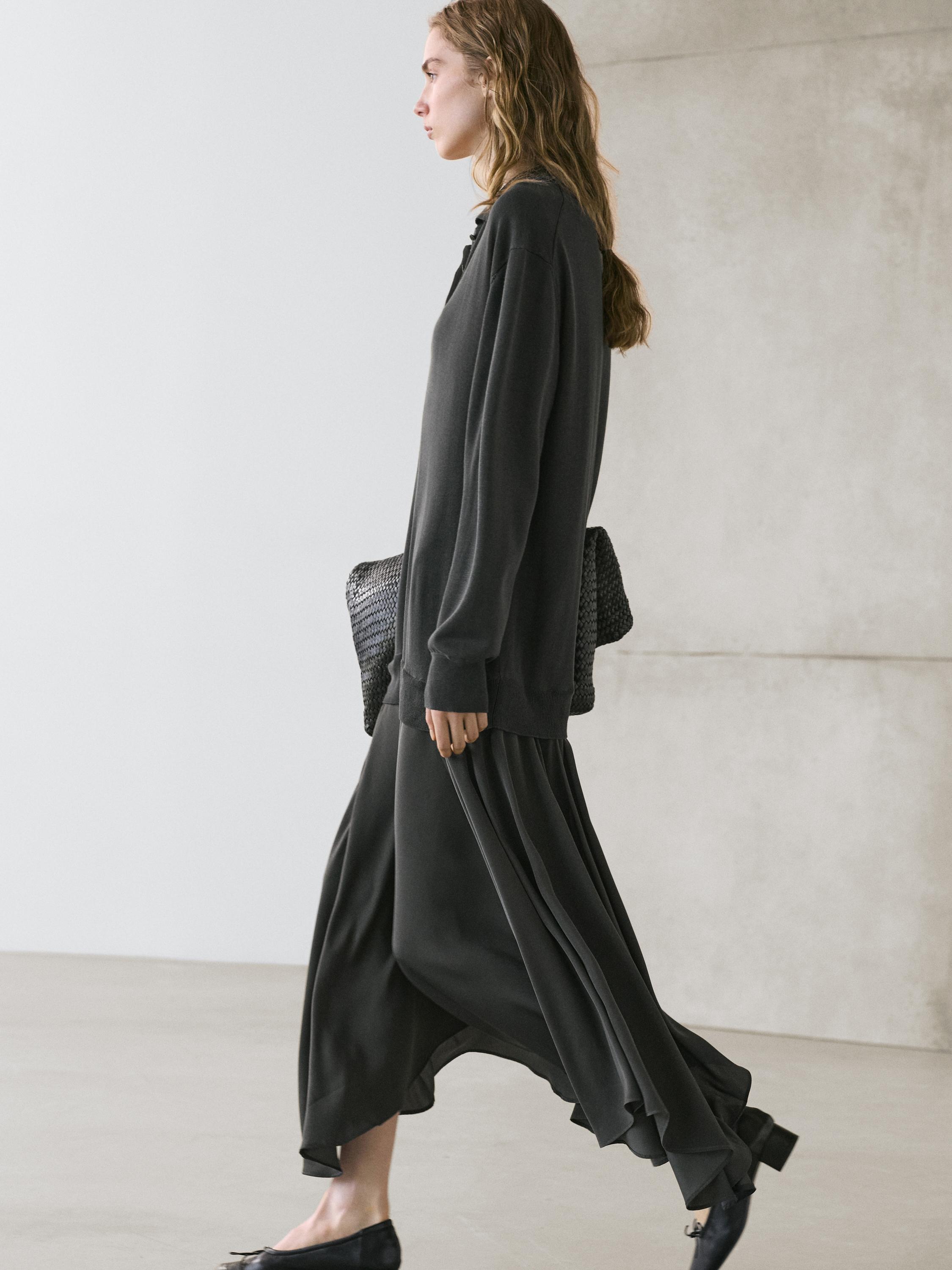 Üst kısmı triko ve altı fırfırlı etekli midi elbise.. Uzun kol. Düğmeli polo yaka.