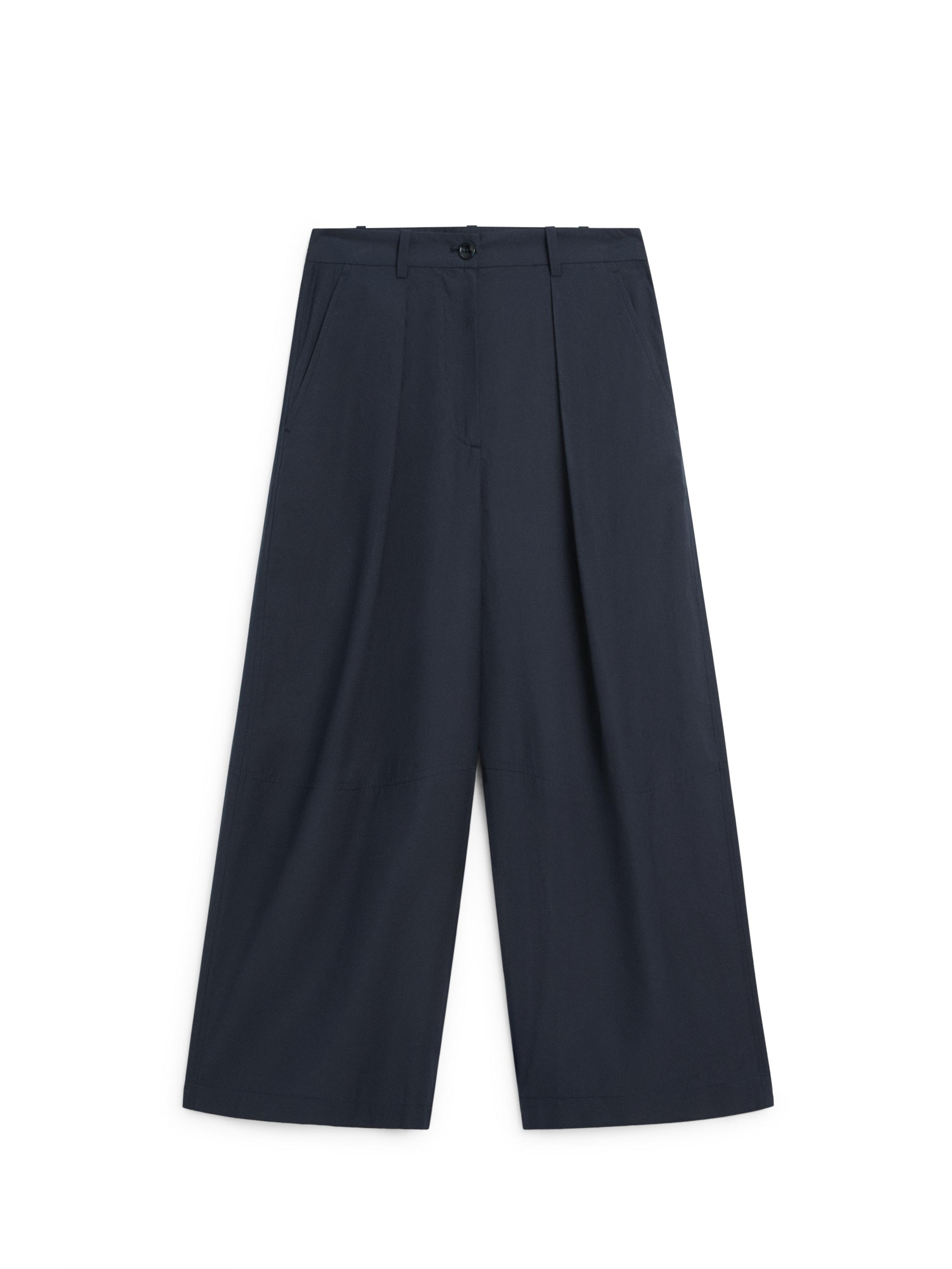 Geniş paça pantolon. Önü fermuarlı ve üstten düğmeli. İki yan cep. Önü pilili.