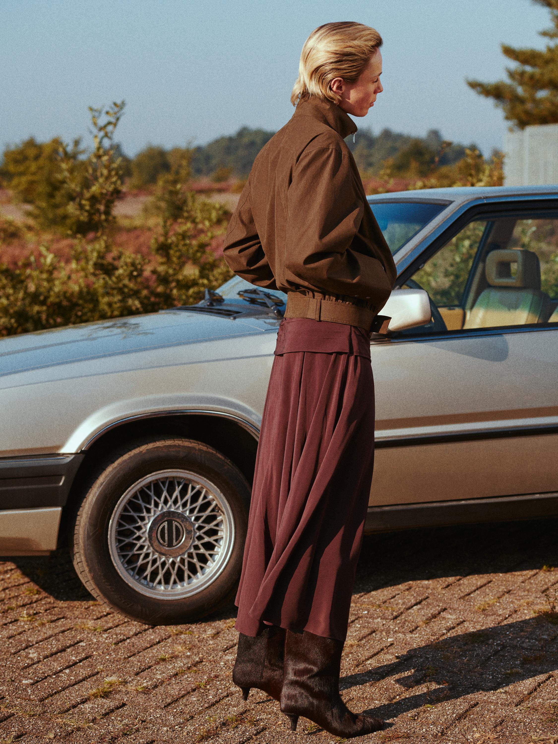 Drapeli kuşak kemerli uzun dökümlü elbise