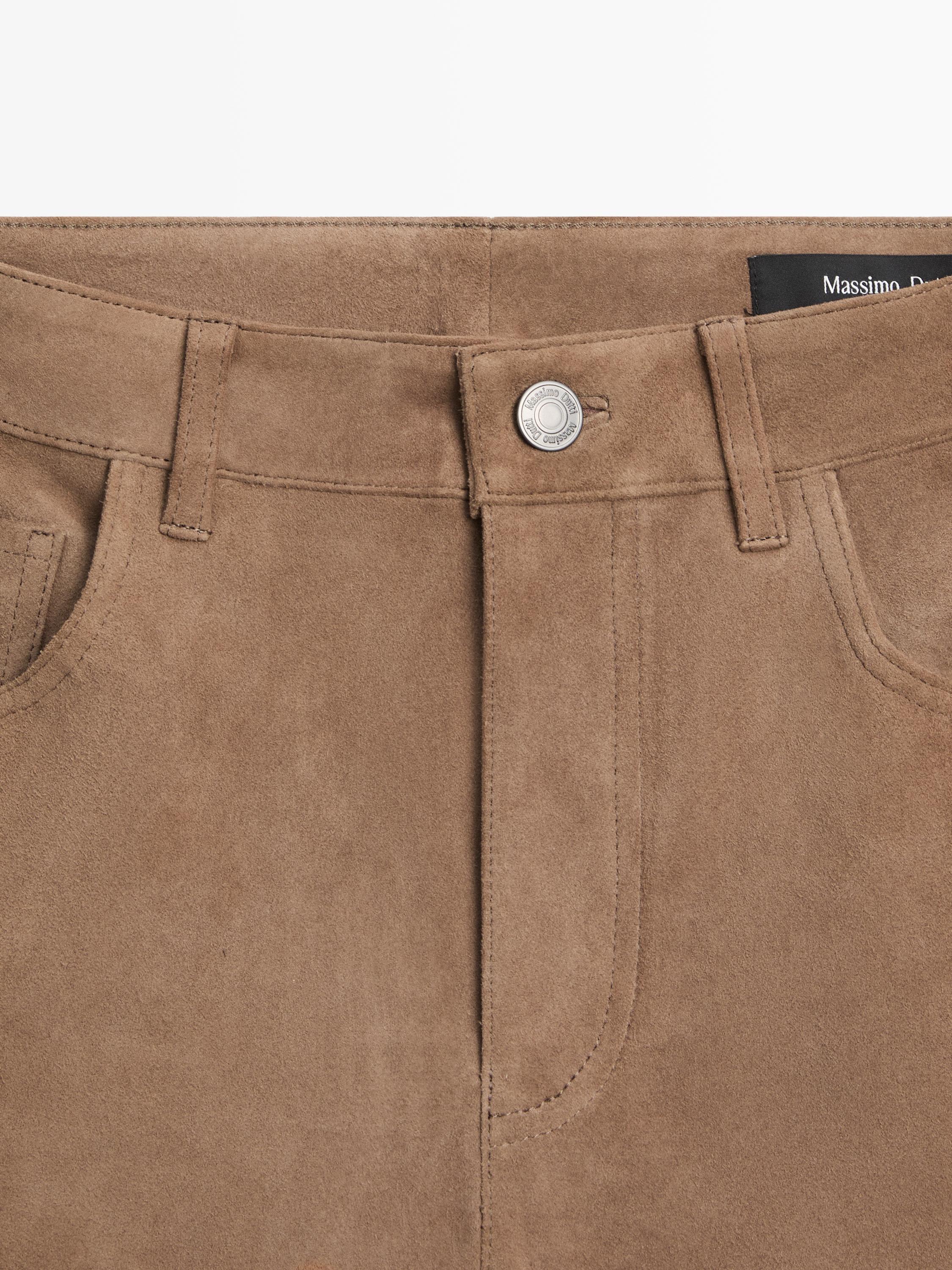 Süet yüzeyli keçi derisi tayt. Önü fermuarlı ve üstten düğmeli. İki yan cep. Yarım astarlı.