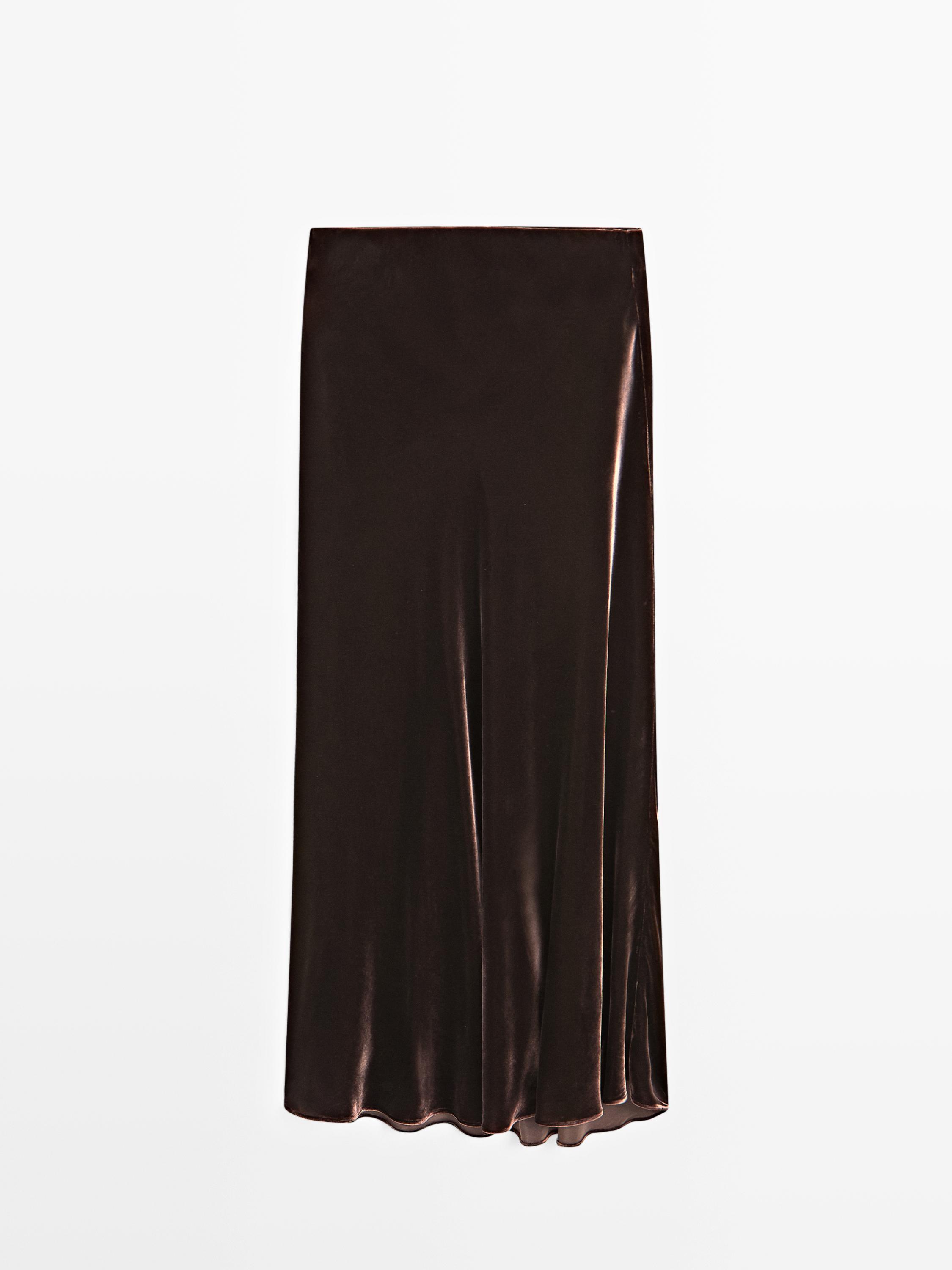 A kesim uzun etek. Kadife kumaş. Elastik bel bandı detaylı. Uyumlu giysi mevcuttur.