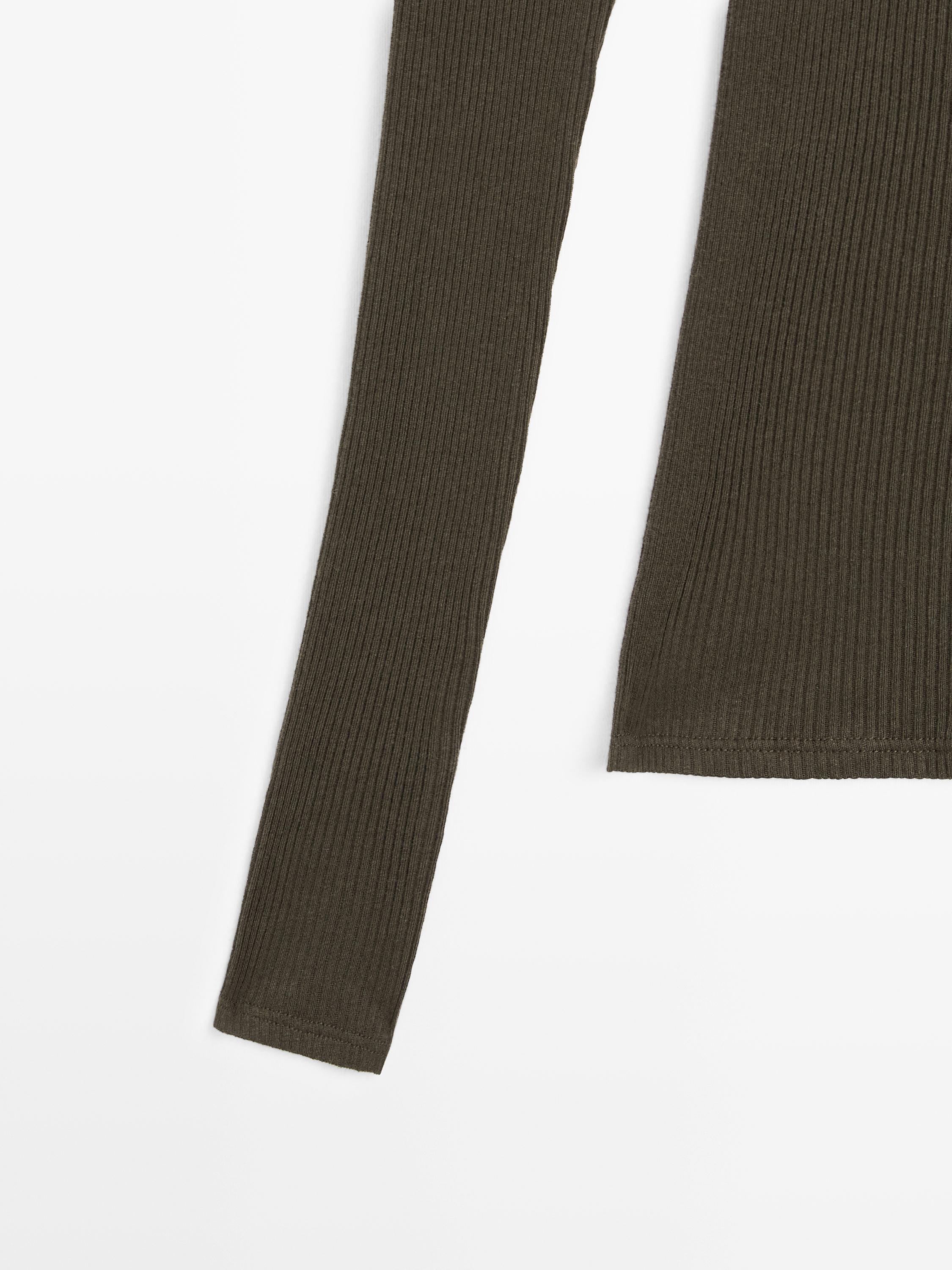 Camiseta de punto confeccionado en tejido mezcla algodón. Cuello redondo. Manga larga. Tejido canalé.