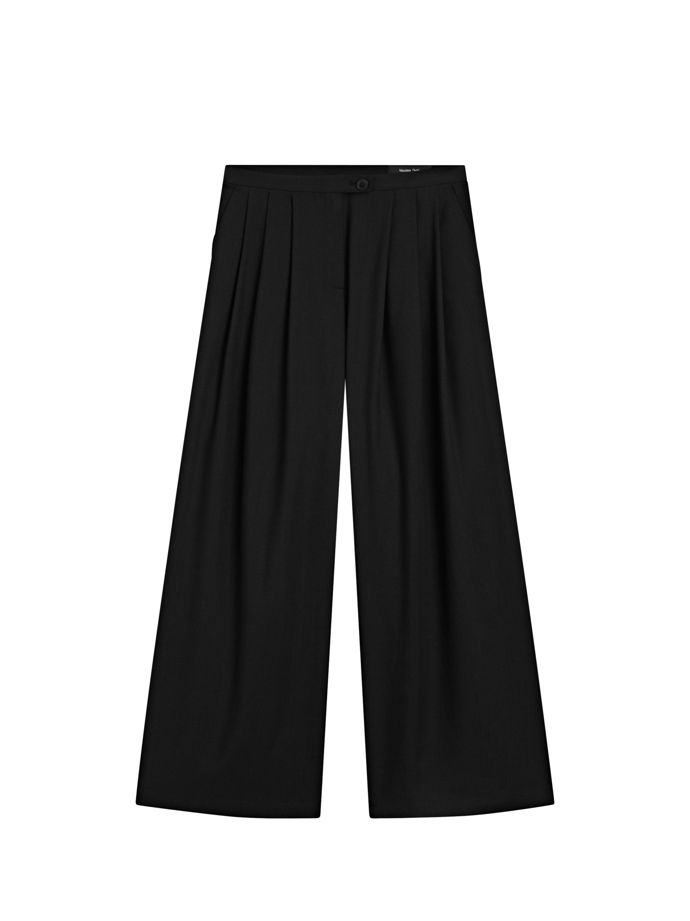 Pantalón ancho con tejido fluido. Cierre mediante cremallera oculta por tapeta, botón y tira abotonada. Dos bolsillos laterales. Detalle de pinzas en la parte frontal.