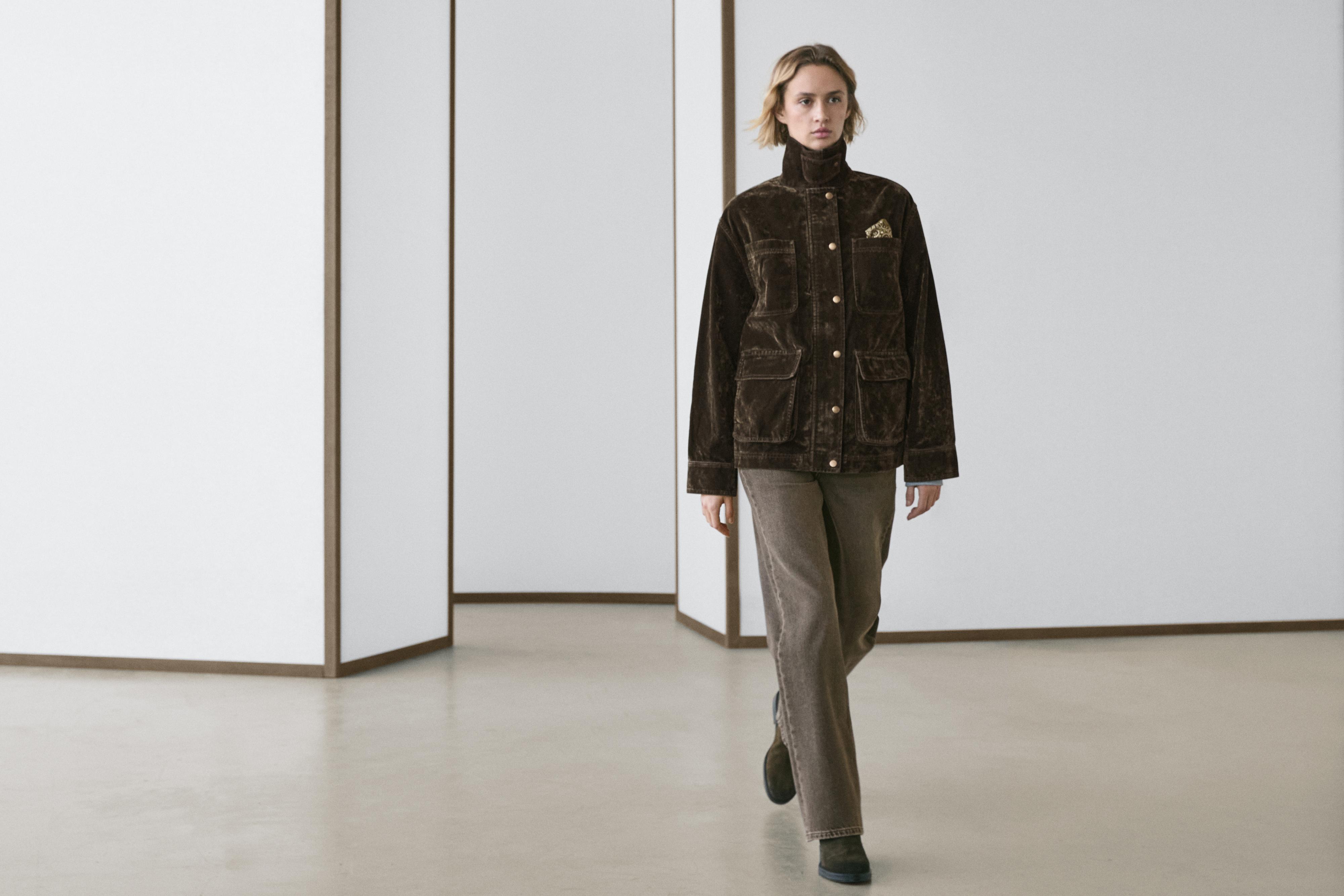 Denim effect jacket . Long sleeves with buttoned cuffs. Concealed zip with snap-button placket. Four patch pockets. Flock finish, velvety effect, soft to the touch. Collar detail.