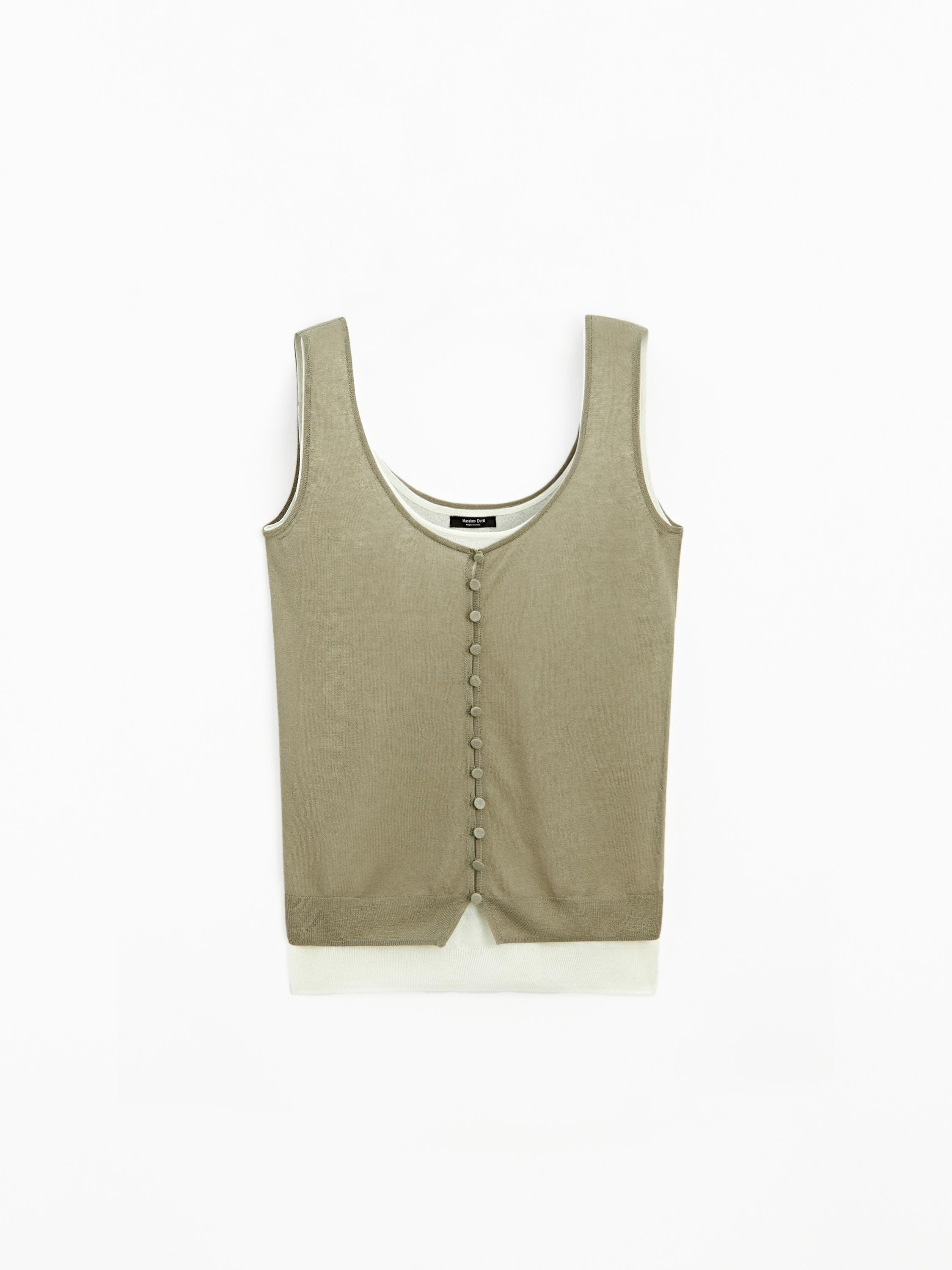 Knit overlaid top. Round neck. Sleeveless. Ribbed trims . Covered button detail .