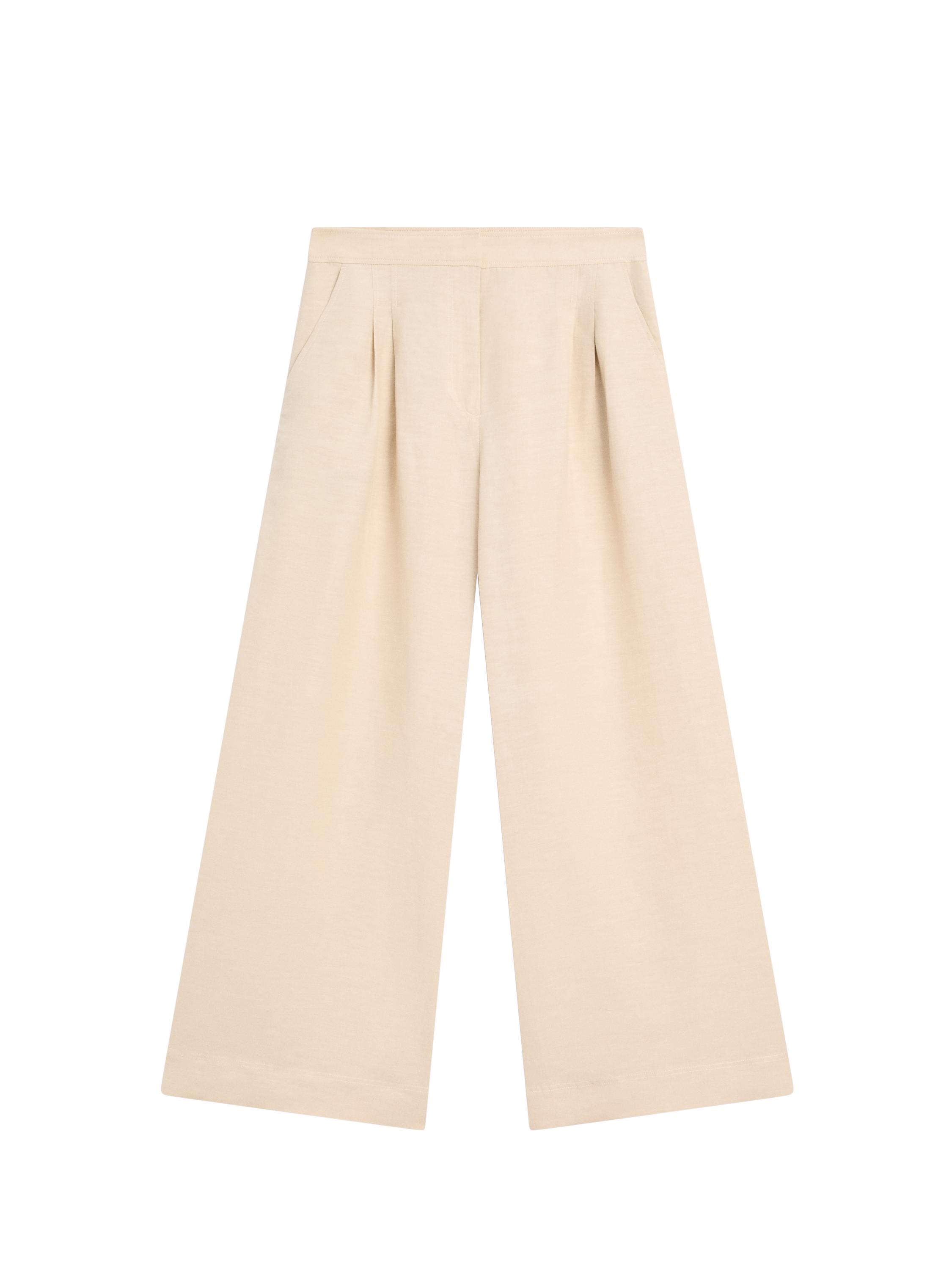 Wide-leg trousers. Concealed zip and hook-and-eye fastening. Two side pockets. Two patch pockets on the back. Made of a linen blend. Matching garment available.