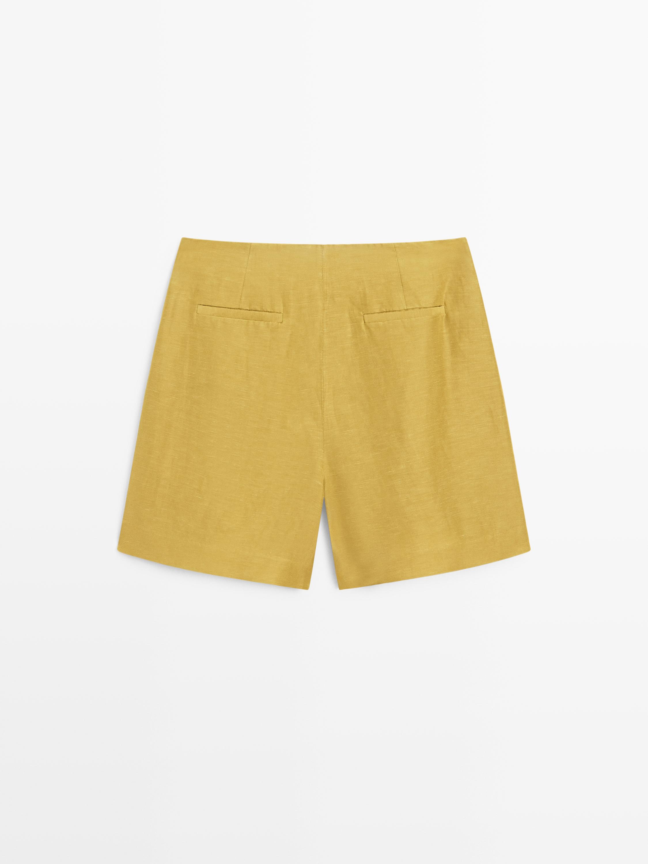 Short Bermuda shorts made of linen blend fabric. Zip fastening. Two side pockets. Two welt pockets on the back. Darted detail on the front.