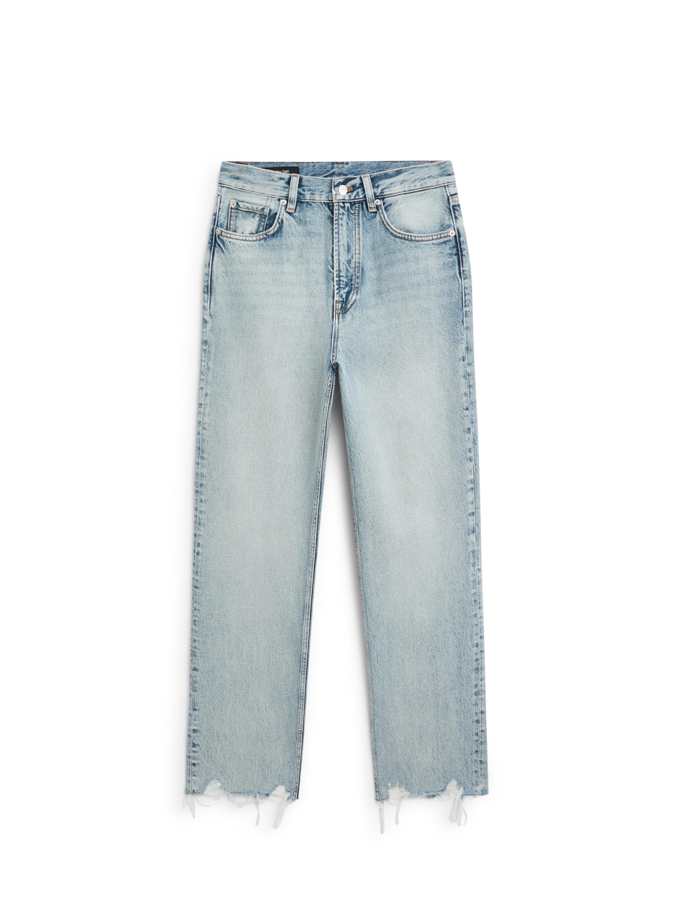 Straight-leg Jeans: straight silhouette from waist to ankle, with no additional leg adjustments. Belt loop details . Front zip and top button fastening. Five-pocket design. Frayed hem.