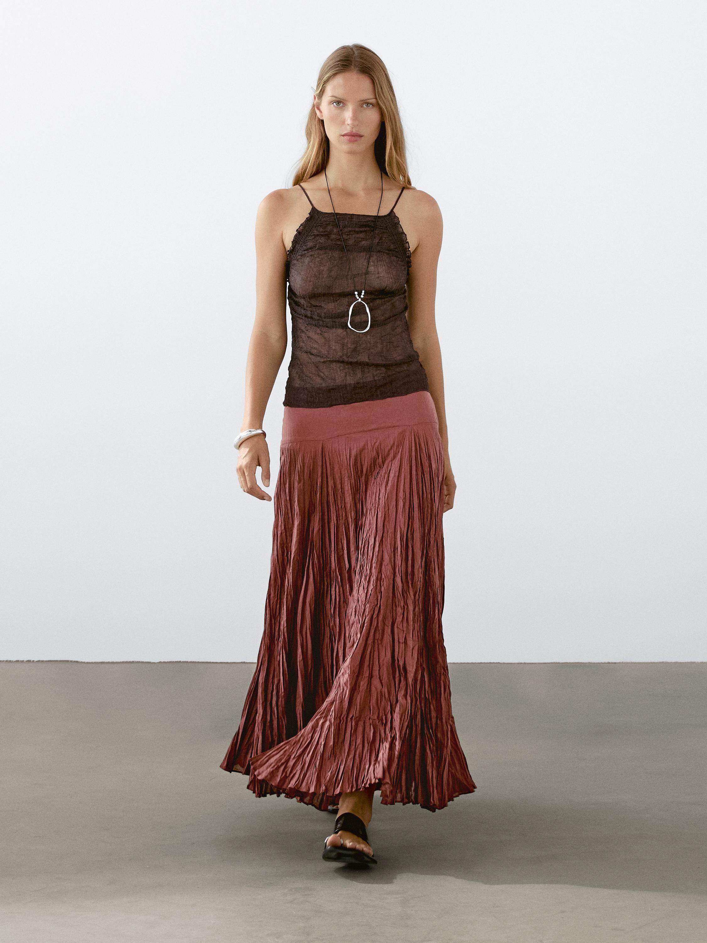 Xalter yoqali top . Ingichka tasmalar. Ochiq orqa komponentli. Gʻijim effektli komponent. Yarim-shaffof mato.