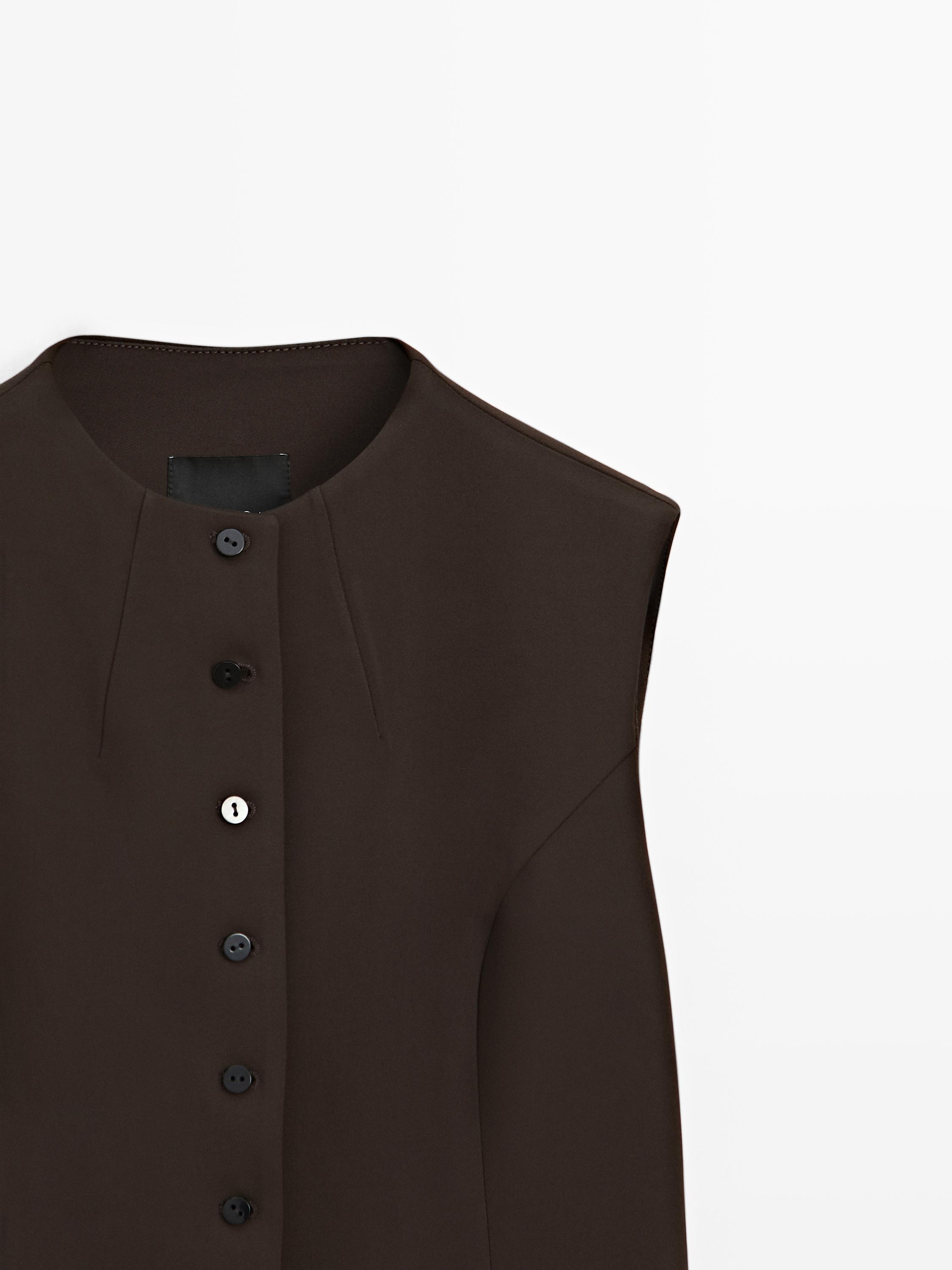 Nimcha. Tanani aniqroq va xushbichimroq ko‘rsatadigan biroz toraygan siluet. Aylana yoqa. Yengsiz. Oldi uzunasiga tugmali. Mos rangdagi kiyim mavjud.