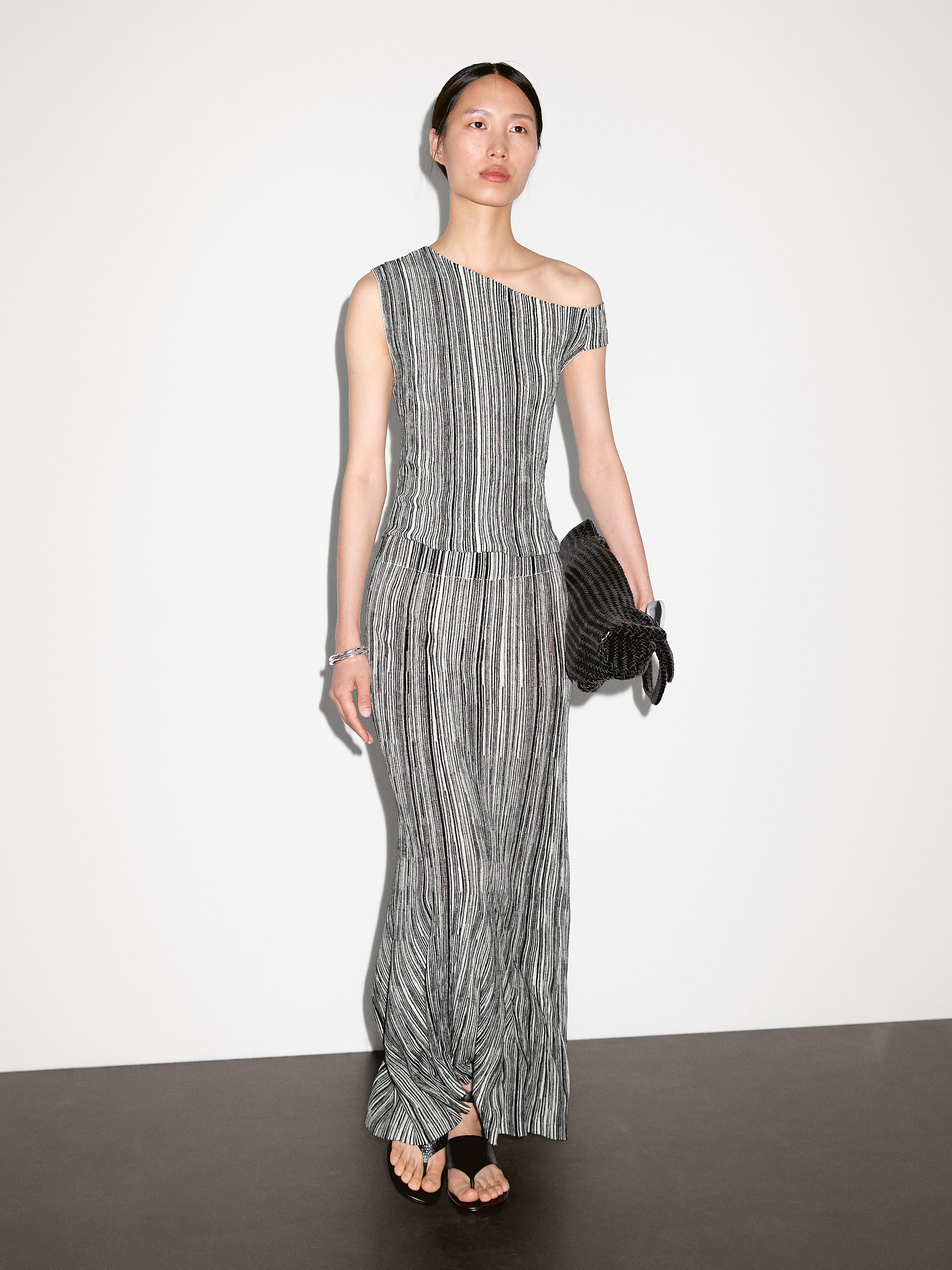 Asimmetrik yoqali top. Yengsiz. Yoʻl-yoʻl gull. Mos rangdagi kiyim mavjud.