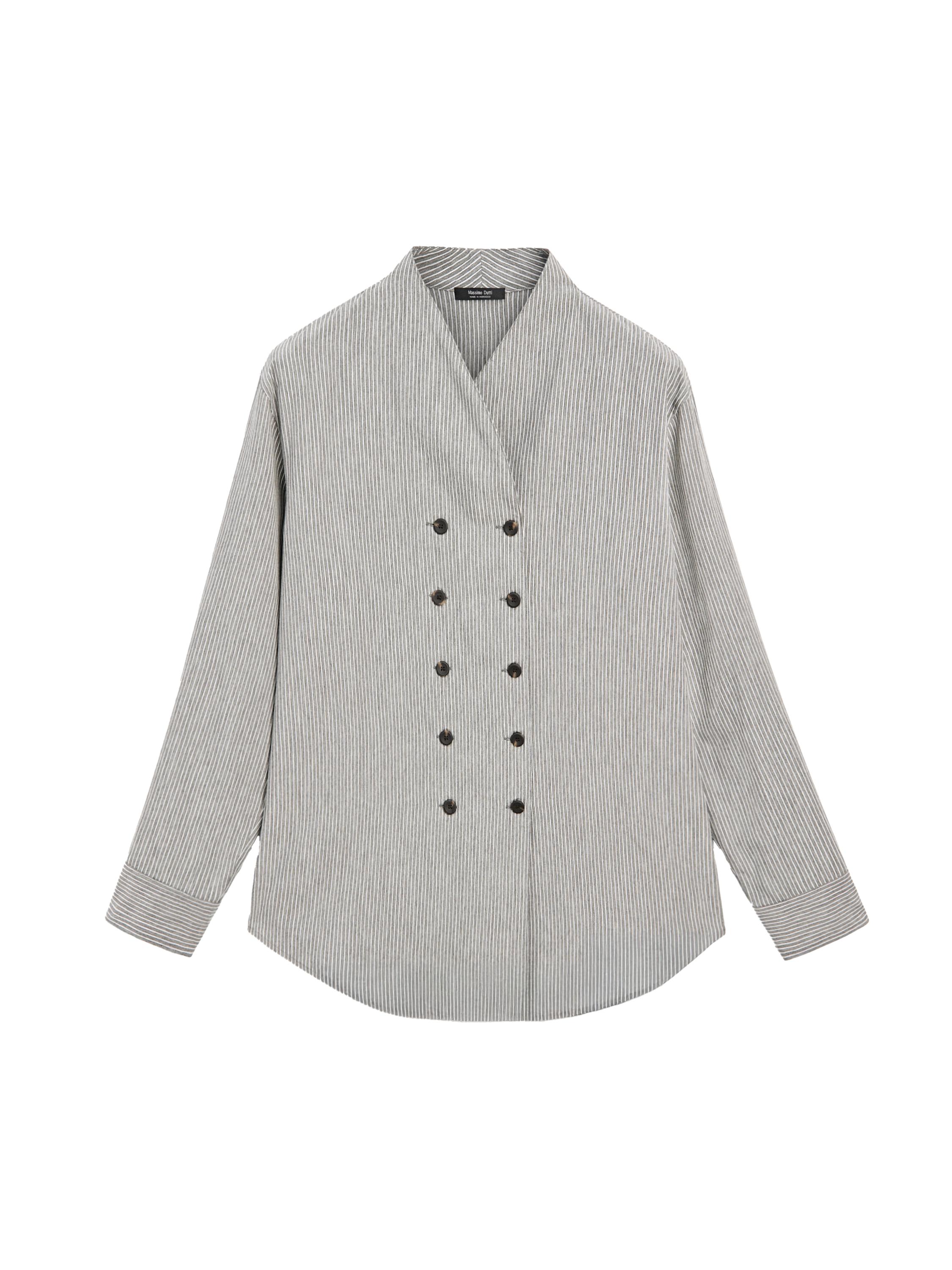 Flowing shirt. Long sleeves with buttoned cuffs. Double-breasted button fastening. High collar. Striped detail.